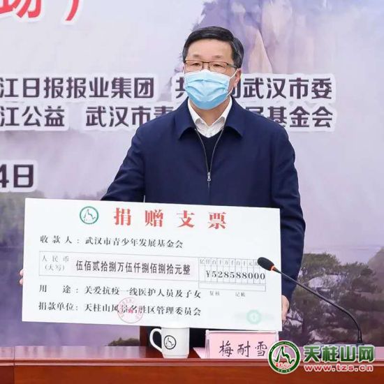 中共潛山市委書記張勁松出席捐贈儀式并致辭,市委副書記、市人民政府市長、天柱山管委會主任梅耐雪代表天柱山管委會向長江日報長江公益、武漢市青少年發(fā)展基金會捐贈資金5285880元,市委常委、天柱山管委會副主任涂高生,市人民政府副市長蔡婷婷出席儀式。長江日報報業(yè)集團(tuán)負(fù)責(zé)人出席儀式并講話,共青團(tuán)武漢市委負(fù)責(zé)人向天柱山管委會頒發(fā)榮譽(yù)證書,天柱山風(fēng)景區(qū)、長江日報長江公益、武漢市青少年發(fā)展基金會三方代表簽訂《天使的孩子—關(guān)愛武漢抗疫醫(yī)護(hù)人員及子女·天柱山基金》協(xié)議書。