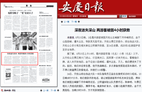 安慶日報:深夜迷失深山 兩游客被困4小時獲救