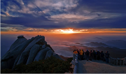 特色: 朗朗乾坤,綺霞紛祥;山清水秀,艷陽高照。當清晨的第一抹陽光穿透薄薄的云霧,刺射晨初的水露散射在萬丈高空,山下仰望,那是山與光的相互依托,一映一景,盡態(tài)極妍,極顯天柱峰光。晨陽漸升,松云環(huán)腰,時輕時濃,滿山蒼翠若隱若現(xiàn),每至峰頂散陽透入,則如金環(huán)系腰,風云變幻,盡展天柱奇祥。及至正午,撥云見日,南山當戶轉(zhuǎn)分明。屹立天柱之巔,城中景盡收眼底。更甚則是六月清和雨...